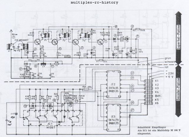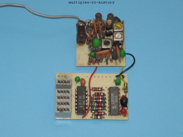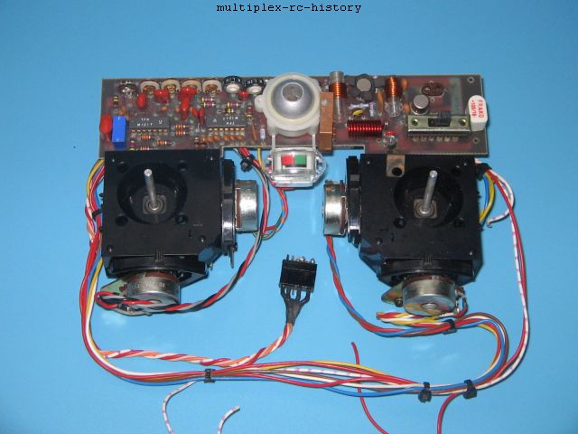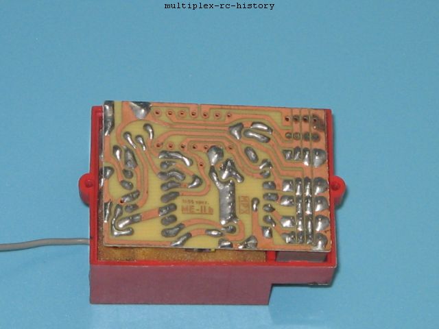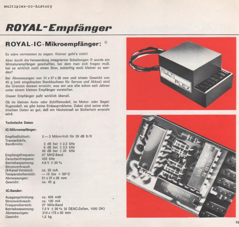 An dieser Stelle hätte man mit der Entwicklung von Fernsteuerungen aufhören können. Doch lassen Sie uns weiter schauen, was die Fa. Multiplex (S. Kussmaul) noch alles mit der MPX Royal eingeführt hat. Da ist der Empfänger zu nennen, der weitgehend in einem Gehäuse mit 2 Platinen untergebracht ist. Die Schaltungen auf den Platinen sind für die damalige Zeit durch die verwendeten integrierten Schaltkreise ein modernstes technisches Design gewesen. Eine ausführliche Testanalyse können Sie von Erich Rabe in der Zeitschrift "Modell" von April 1972 nachlesen.