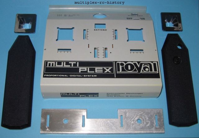 Die Multiplex Royal Fernsteuerung hat ein modernes und pragmatisches Senderdesign bekommen. Das Sendergehäuse ist jetzt aus kunststoffkaschiertem Alublech an der Ober- und Unterseite gefertigt. die Seitenteile bestehen aus Kunststoffspritzteilen. Die Farbgebung ist weitgehend durch die Folienkaschierung vorgegeben. Ergänzt wird die Oberseite durch eine schwarze Bedruckung mit dem Namen, Schaltstellungen und Logodesign. Die Knüppelmechaniken sind grundlegend überarbeitet worden und zum Teil aus Kunststoff und Blechteilen. Die Mechanikbefestigung (Trichter) sind aus verchromten Kunststoff. Die Steuerknüppel sind variabel (kurz und lang) und austauschbar. Das Sendergehäuse kann als Bauchsender, als auch Handsender benutzt werden. Seitlich finden wir die Ladebuchse, die jetzt auch eine Lehrer/Schüler Funktion hat (Diodenstecker). Auf der Oberseite sind zu finden: ein Wechselquarz im HC 25 U Gehäuse, ein Aus/Ein Schalter, eine Spannungsanzeige, eine Antenne mit Verlängerungsspule und Kugelgelenk (DBGM), vier Trimmregler , eine Tragegurthalterung und zwei zusätzliche Steller für zwei Sonderkanäle.