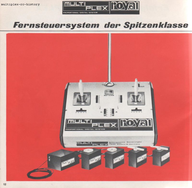 Ab 1970 bietet die Firma MULTIPLEX - ELEKTRONISCHE STEUERUNGEN, 7532 Niefern bei Pforzheim, Hauptstrasse 2 die Multiplex Royal Fernsteuerung an. Dies ist wichtig zu wissen, da sich der Firmenname von S.Kussmaul ing., 7532 Niefern, Luisenstrasse 58 geändert hat.