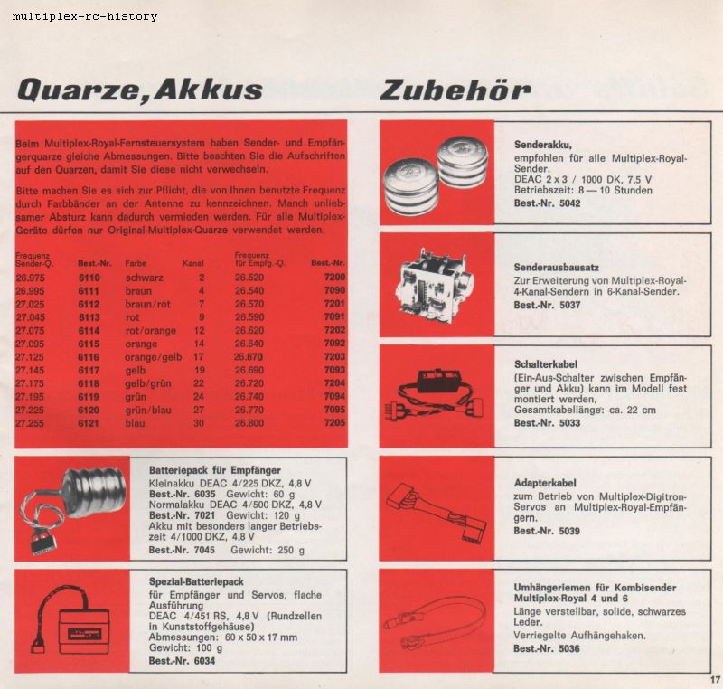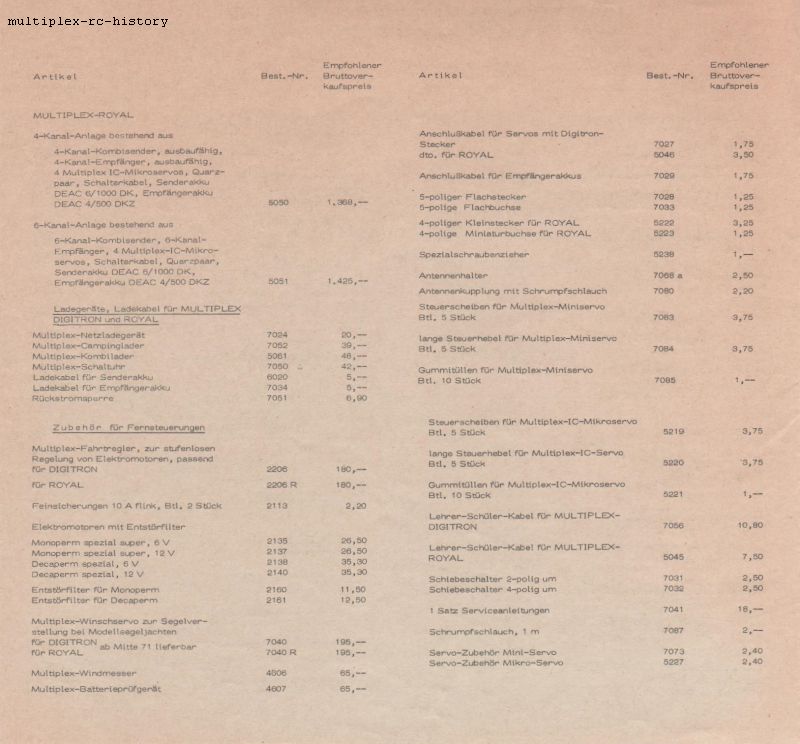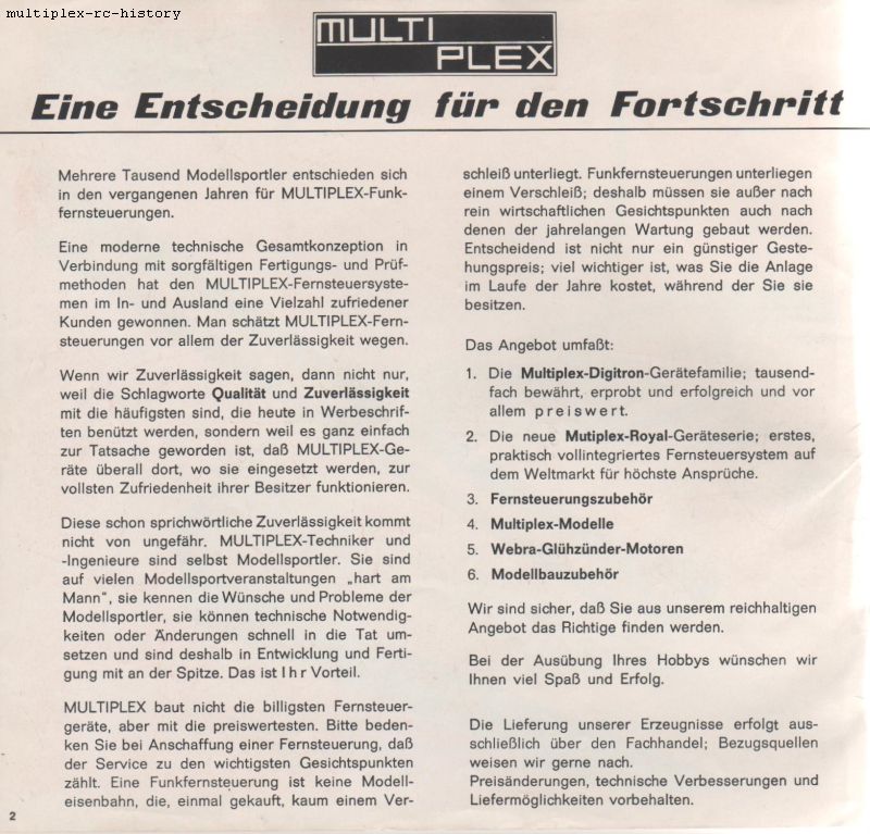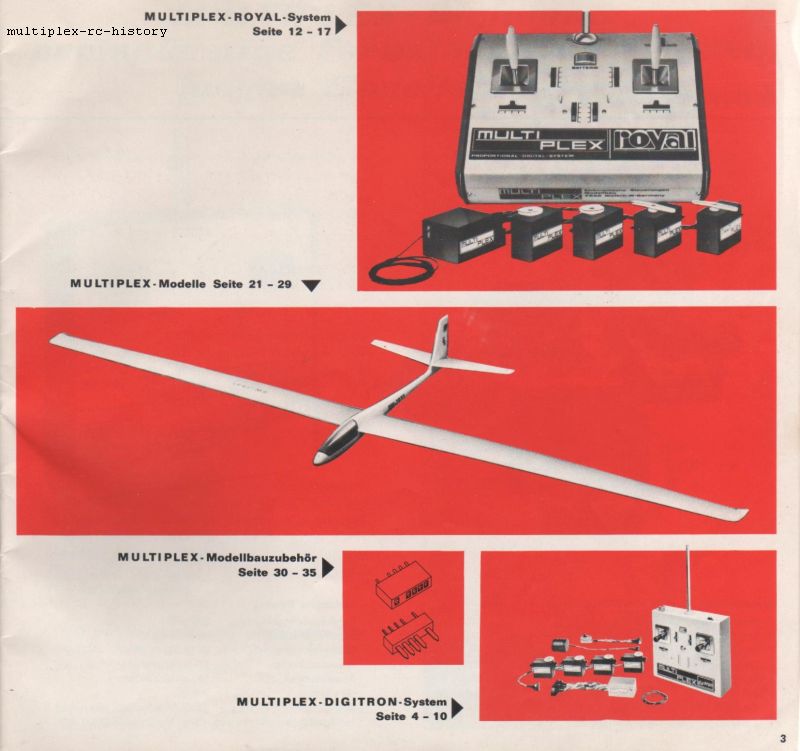 Zum besseren Verständnis der Multiplex Royal Fernsteuerungen, zeige ich Ihnen hier Ausschnitte aus dem Katalog von 1971. Wir werden anhand des Kataloges die Produkte dann näher kennenlernen. Auch alle technischen Daten sind im Katalog weitgehend aufgeführt.